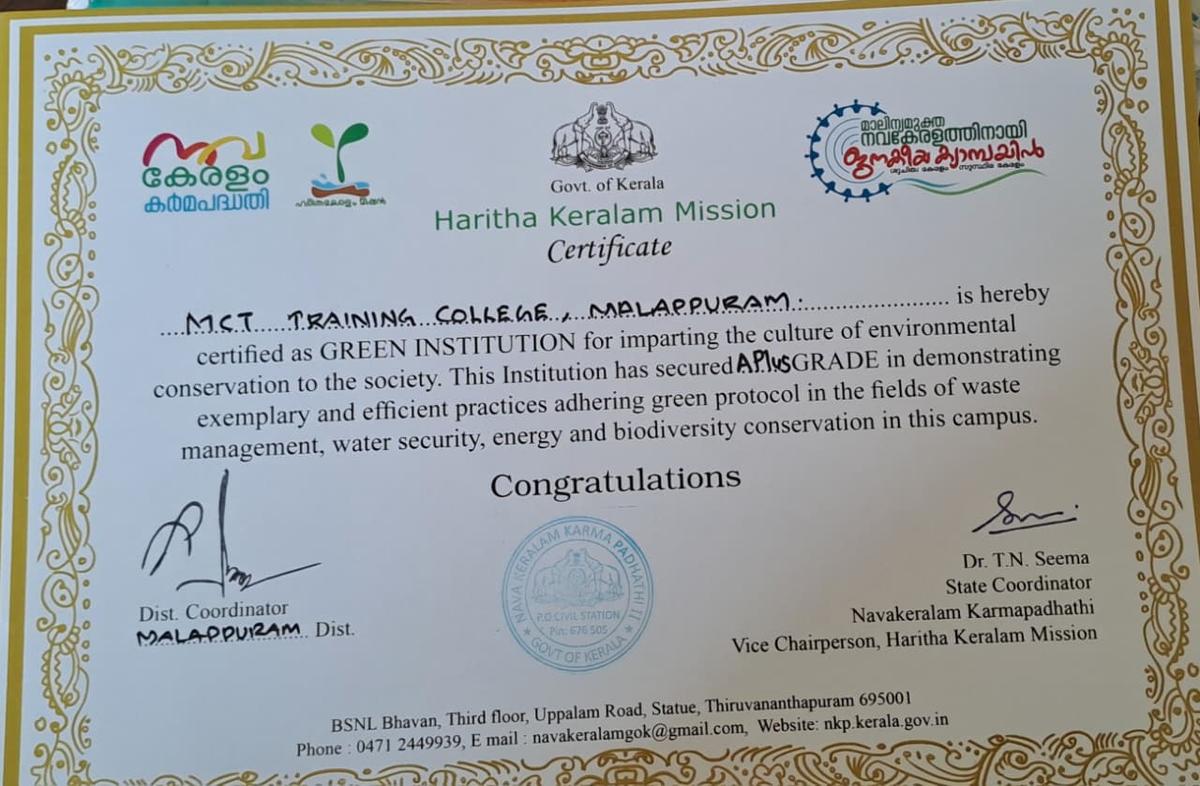 MCT Training College has been awarded the Green Campus Certification by the "Haritha Keralam Mission" in recognition of its efforts to promote a culture of environmental conservation within the community.